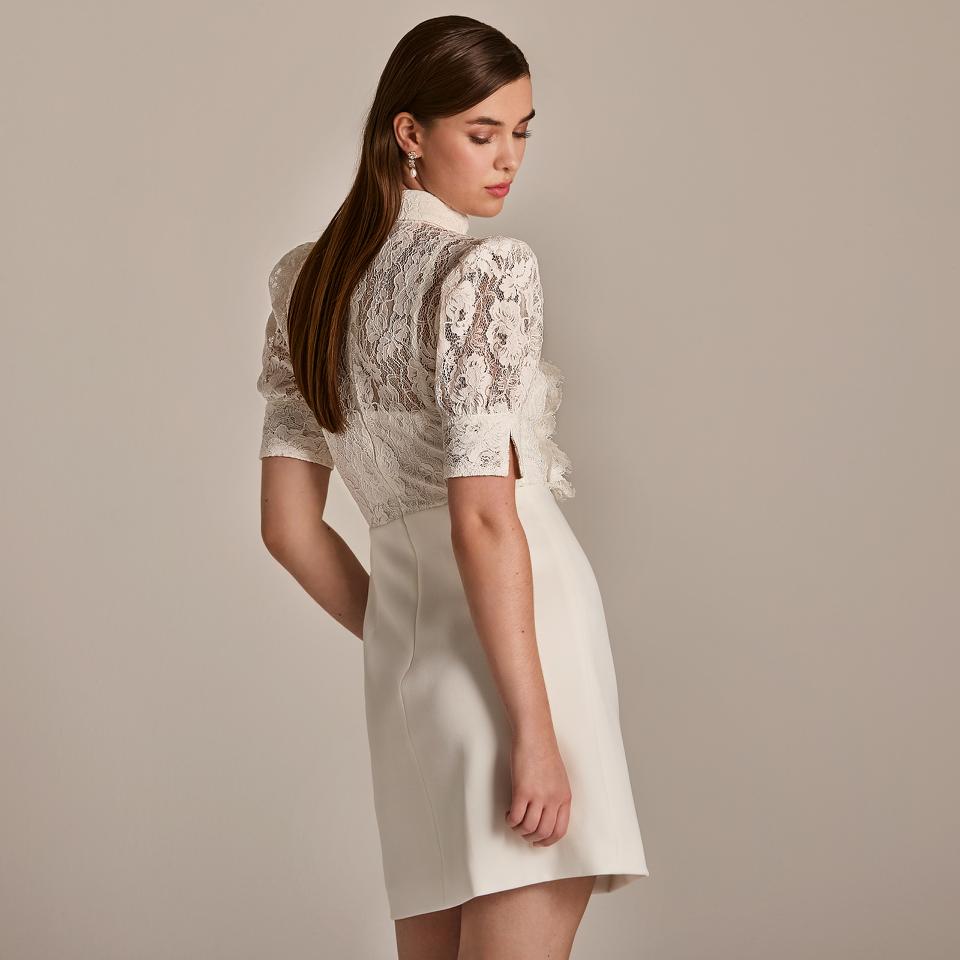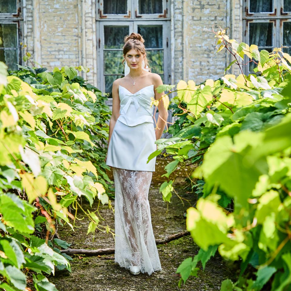 Viele Bräute kombinieren ihr Braut-Mini mit dramatischen Overskirts, abnehmbaren Schleppen oder transparenten Spitzenröcken, die einen wandelbaren Multi-Look-Effekt kreieren. Dieser Trend verbindet Eleganz mit Leichtigkeit und Spaß und bietet eine ausdrucksstarke Option, die sowohl modisch progressiv als auch perfekt für die Feier geeignet ist.