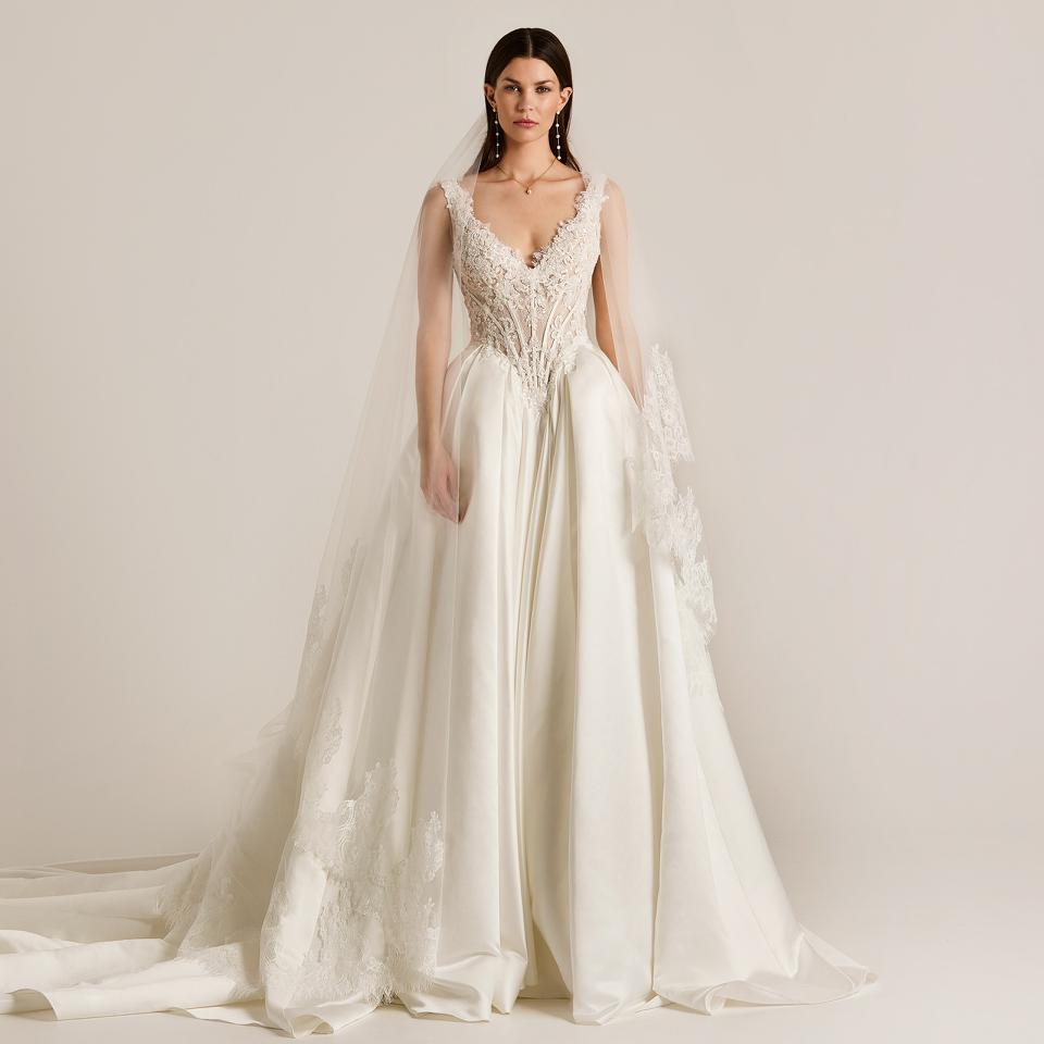 Whether executed through clean corsetry, folded satin, or structured drapery, the cat-eye neckline brings a bold, contemporary elegance to bridal design and appeals to the bride who loves couture-inspired detail.