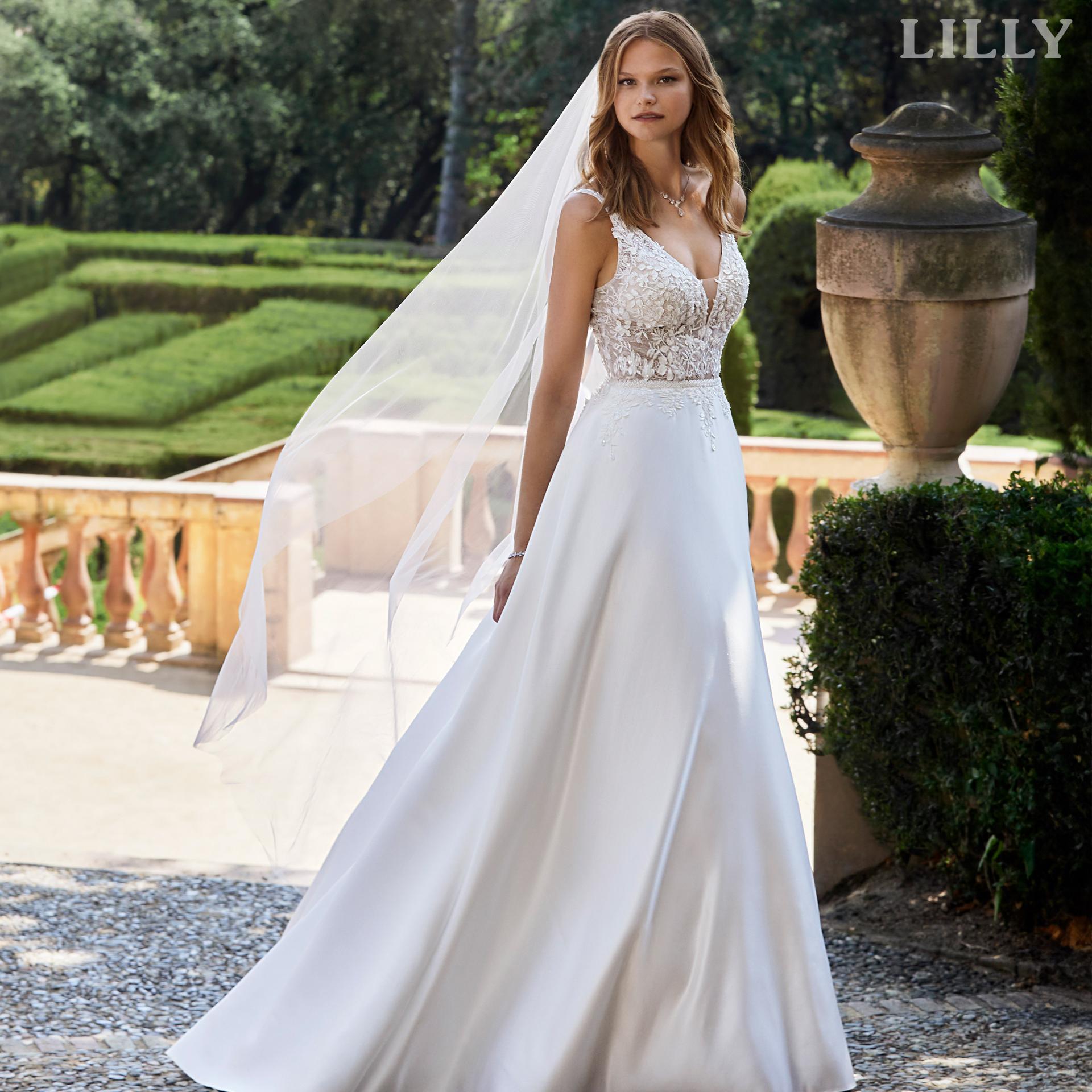 Ein edles LILLY Satin-Brautkleid in weiter A-Linie mit einem traumhaft bestickten Spitzen-Oberteil, das bei jeder Bewegung funkelnde Akzente setzt. Die versteckten Taschen im Rock sind nicht nur praktisch, sondern verleihen dem Kleid auch eine moderne, jugendliche Note.