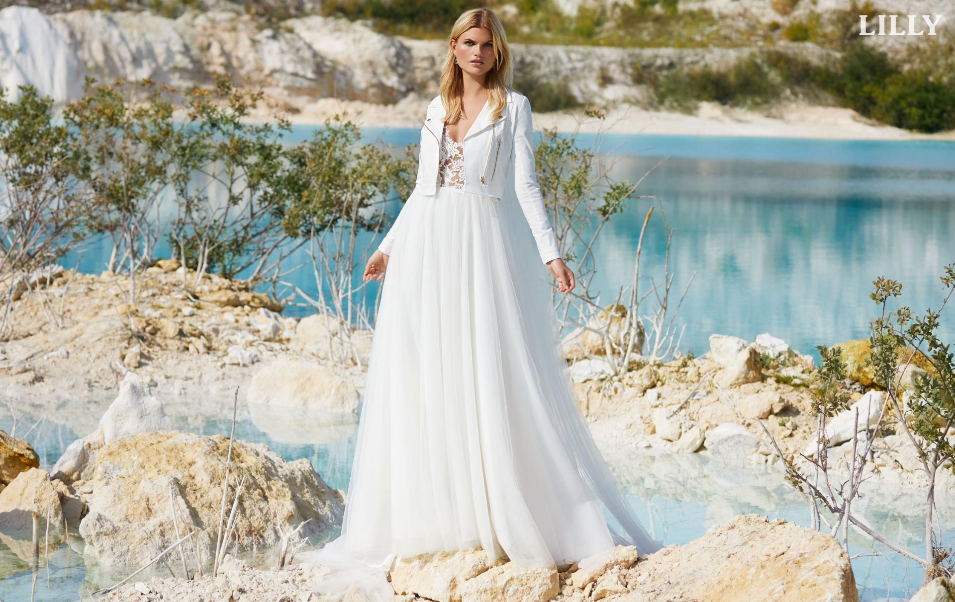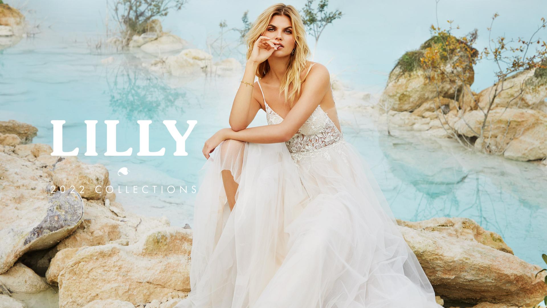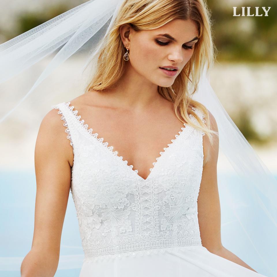 Im Fokus stehen weiche fließende Silhouetten, aufregende Spitzen-Layerings, tiefe Ausschnitte und subtile Semi-Transparenzen, die außergewöhnliche Optiken voller Leichtigkeit entstehen lassen. Zum „Perfekt Match“ wird der hinreißende Miro-V-Ausschnitt: Bis zur Taille hinunterreichend und gerne in breiten Bordüren-Passen mündend, unterstreicht er den natürlichen und doch eleganten Charakter der LILLY Brautkollektionen.