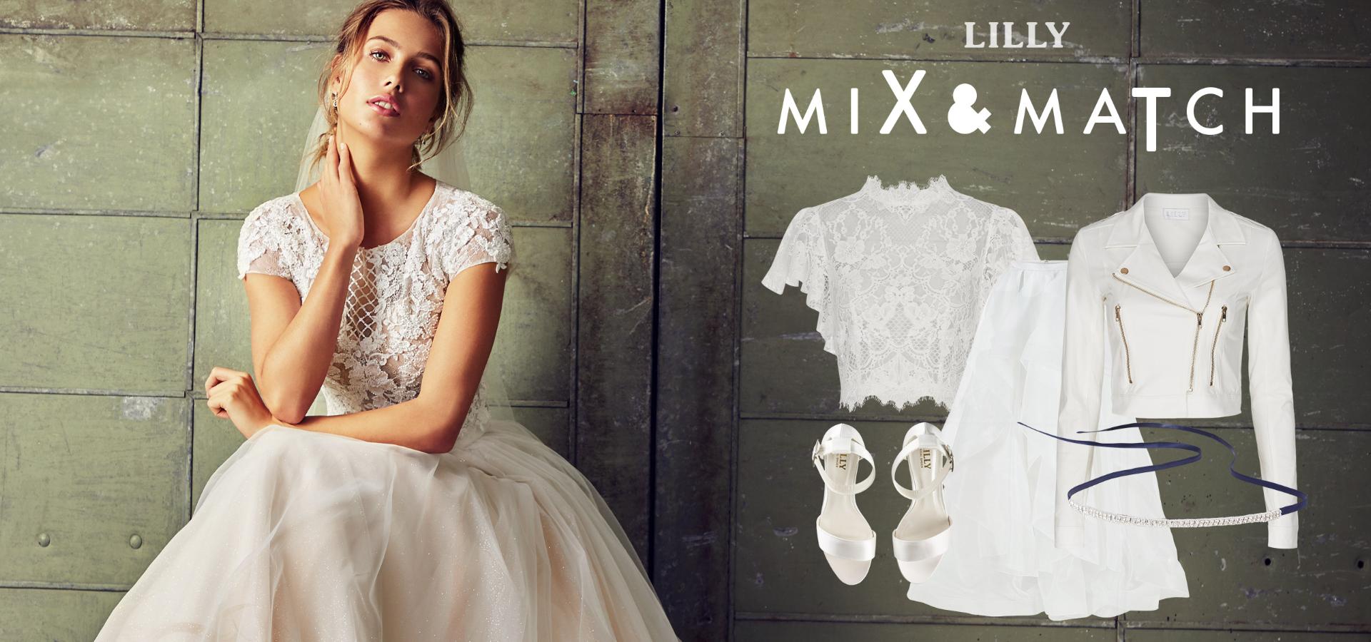 Die wunderschöne Mix & Match Brautmode finden Sie bei ausgewählten LILLY-Händlern oder online unter www.weddingdress.com.