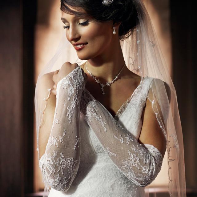 Glitzer & Schleier: Sie umrahmen dein Gesicht wunderschön. Besonders Brautschleier mit Glasperlen und Pailletten setzen schimmernde Licht-Highlights – wie leuchtende Eiskristalle.