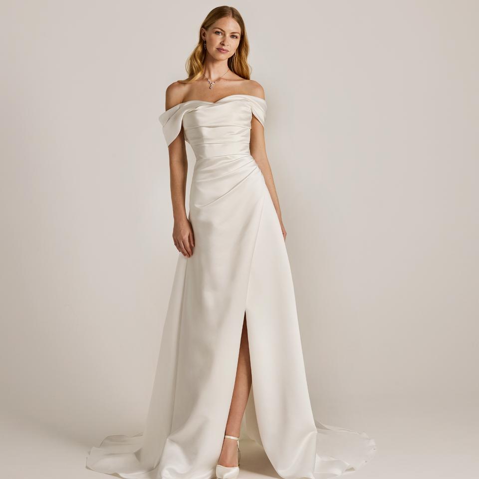 - Minimalist satin gowns with modern draping